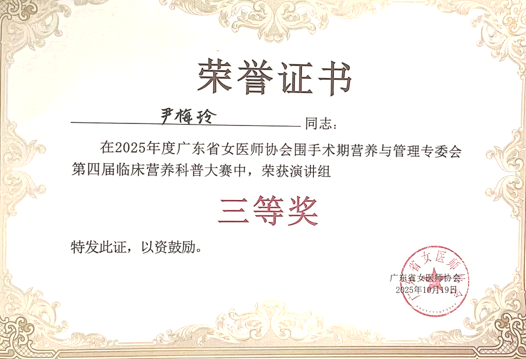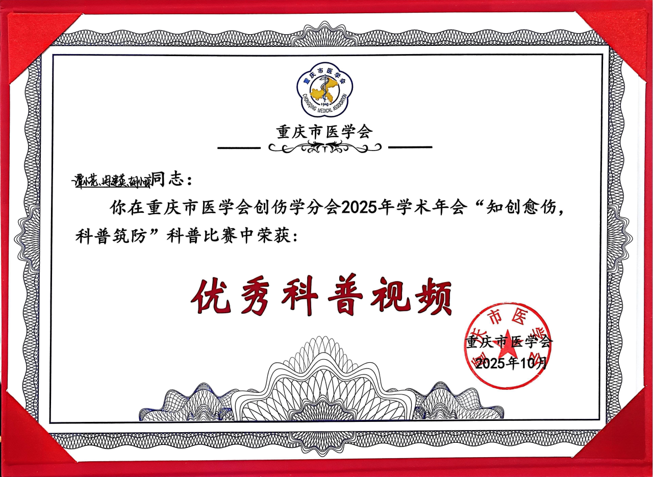 在重庆市医学会创伤学分会主办的2025年“知创愈伤,科普筑防”学术年会科普比赛中,骨伤科三病区(创伤方向)魏国钱、向娟、霍文惠报送的《预防跌倒,守护安全》被评为“优秀科普海报”,骨伤科二病区(关节方向)谭小花、冉建英、胡小琼报送的《痛风被“痛”掩盖的代谢“求救信”》荣获“优秀科普视频”;同时,骨伤科四病区尹梅玲在广东省女医师协会围手术期营养与管理专委会第四届临床营养科普大赛中荣获演讲组三等奖。