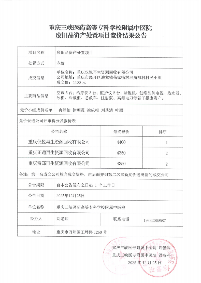 重庆三峡医药高等专科学校附属中医院废旧品资产处置项目竞价结果公告